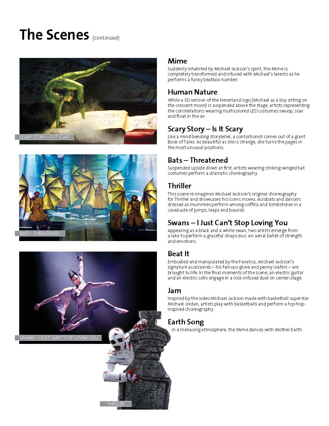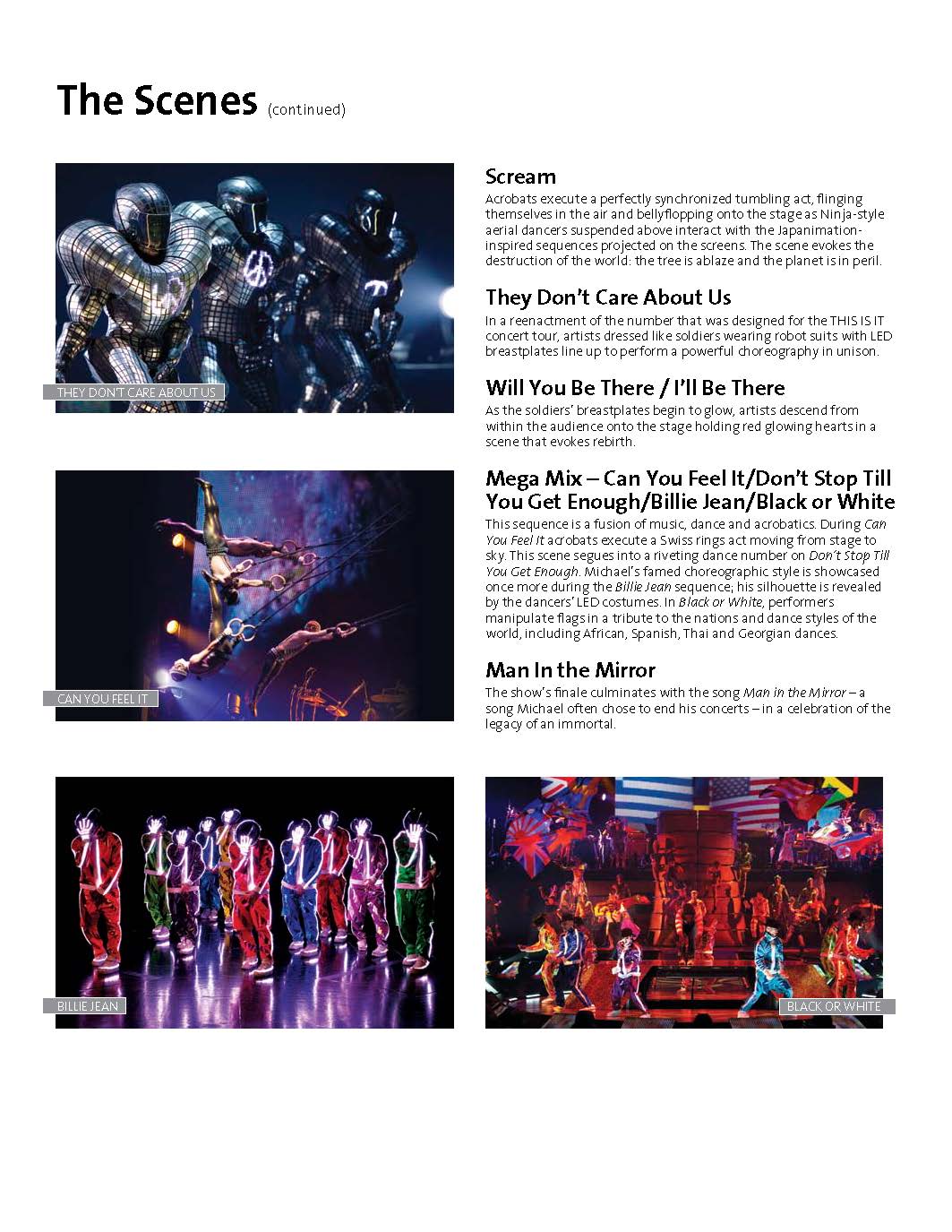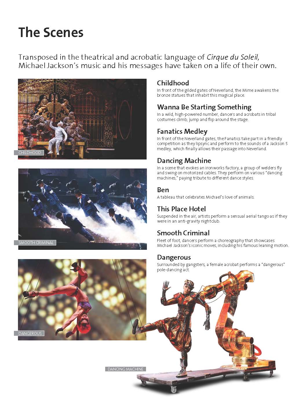 Beginning with the "Childhood" scene, the show will take the audience through 30 of Jackson's popular songs (including "Smooth Criminal," "Thriller," "Beat it" and "Man in the Mirror") with the choreography and artistic flare that comes with a Cirque Du Soleil show.