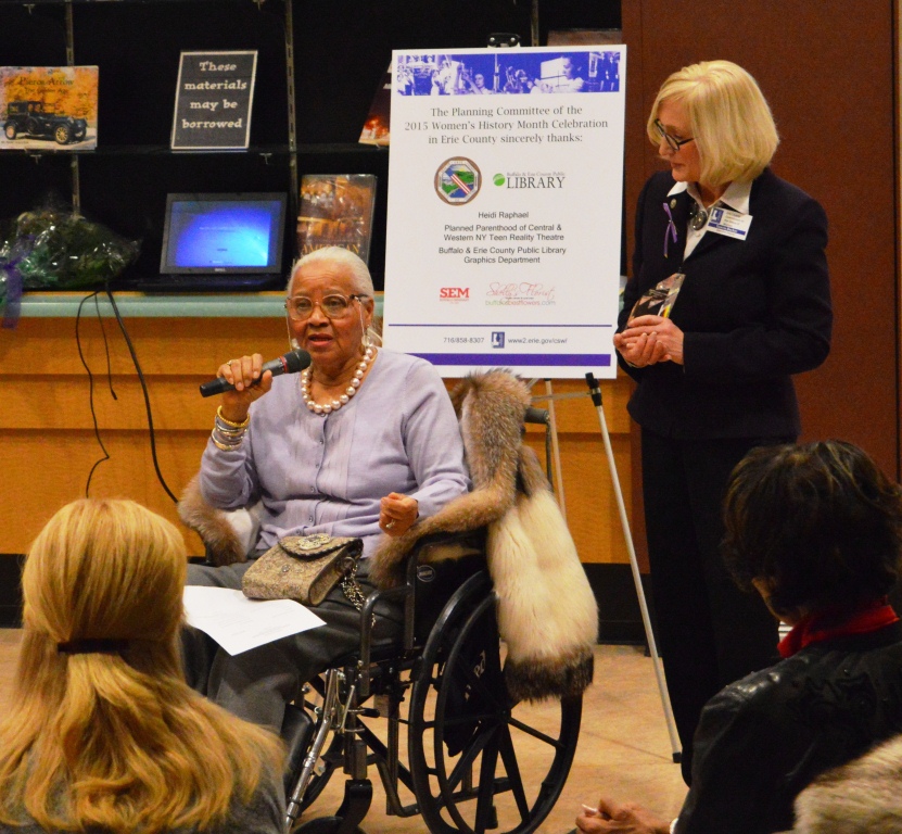 Award winner Constance Bowles Eve gives remarks as Erie County Commissioner of Public Advocacy Sawrie Becker looks on.