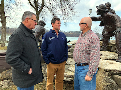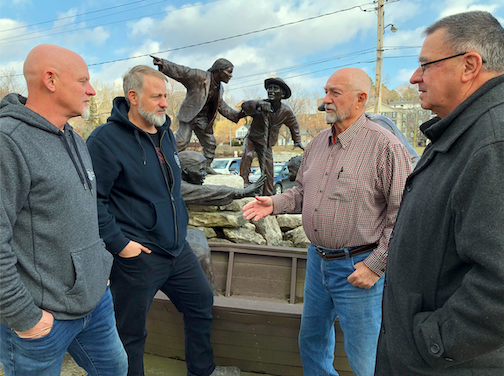 Historic Association of Lewiston members Bruce Sutherland and Ken Slaugenhoupt, right, chat with Eric and Steve Matthews, top, and Ken Bryan, below, of Brickyard Pub & B.B.Q. and Brickyard Brewing Company. Shown behind them is the Freedom Crossing Monument.