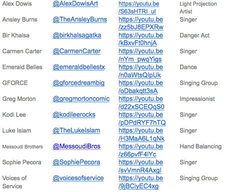 Golden buzzers Kodi Lee, Luke Islam and Sophie Pecora take stage along with Alex Dowis, Bir Khalsa, Carmen Carter, Emerald Belles, GFORCE, Greg Morton, Messoudi Brothers, Voices of Service and wild card Ansley Burns