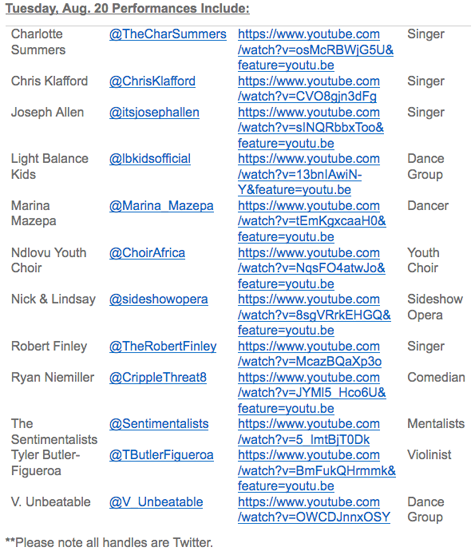 Golden buzzers Joseph Allen, Light Balance Kids, Tyler Butler-Figueroa and V. Unbeatable will take stage along with Charlotte Summers, Chris Klafford, Marina Mazepa, Ndlovu Youth Choir, Nick & Lindsay, Robert Finley, Ryan Niemiller and Wild Card, The Sentimentalists