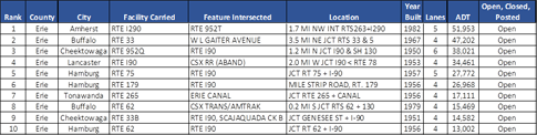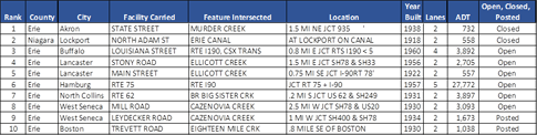 The following 10 poor/structurally deficient bridges in the Buffalo-Niagara Falls area (carrying a minimum of 500 vehicles per day) have the lowest average rating for deck, substructure and superstructure – per the report. Each major component of a bridge is rated on a scale of zero to nine, with a score of four or below indicating poor condition.