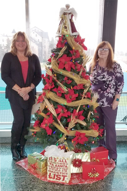 Wheatfield Garden Club members finish decorating a tree at the New York Power Authority.