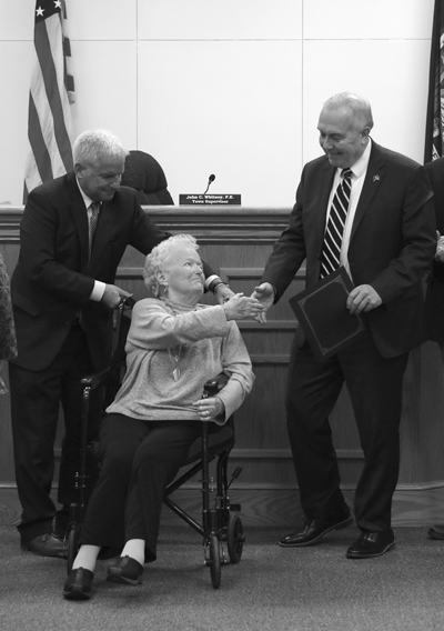 Two retiring members of the town court system received proclamations from the government. Above, Sybil Kennedy accepts a town proclamation from Town Supervisor John Whitney at Monday’s Town Board meeting. Below, Maria Burns thanks the board as she accepts a proclamation. Kennedy and Burns retired recently after a combined 80-plus years of service to the town. (Photos by Larry Austin)
