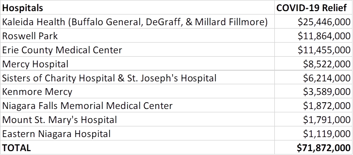 Congressman Brian Higgins on Monday announced more than $71.87 million in federal funding has made its way to Erie and Niagara counties to help hospitals on the front lines of the COVID-19 outbreak.