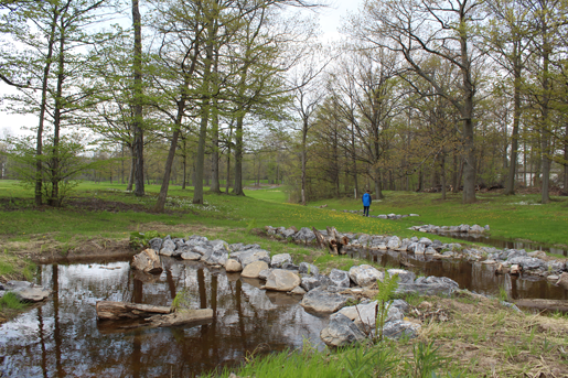 Where Spicer Creek was suffering from steep banks causing shoreline erosion and non-point source pollution from runoff, Buffalo Niagara Waterkeeper restored several sections along the creek at River Oaks Golf Club by re-grading the shorelines; installing salvaged boulders, live stakes and native plants; and creating step-pools to slow, filter and capture runoff before it hits the creek.