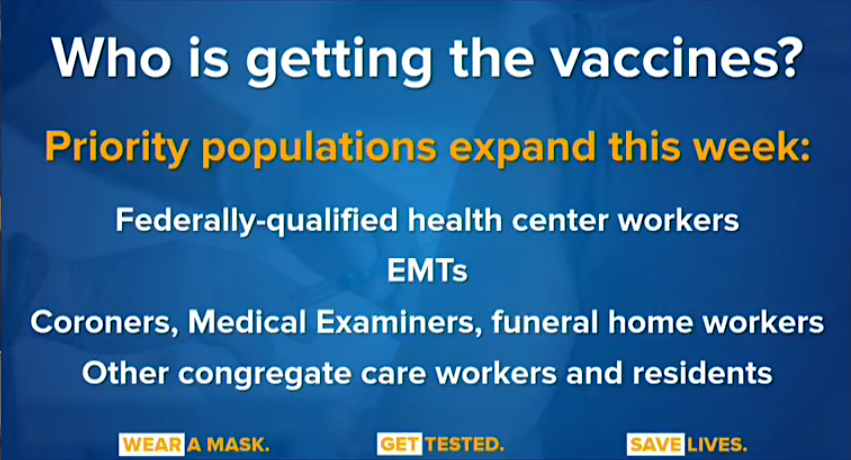 The governor announced a federal program to vaccinate nursing home residents and staff has begun in New York and is expected to vaccinate residents and staff at 618 facilities across the state, with first doses administered starting Monday and over the next two weeks.