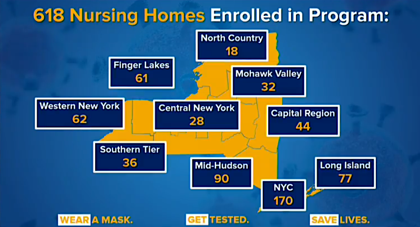 New York began a federal program to vaccinate nursing home residents and staff at 618 facilities enrolled in the program to date. CVS will vaccinate 271 facilities, Walgreens will vaccinate 253 facilities, and other pharmacies will vaccinate 94 facilities. The program in its entirety is expected to take approximately six weeks, including three "clinical days" at each facility: