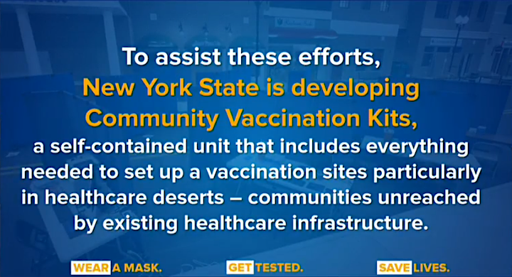 Cuomo said New York is developing community vaccination kits to provide communities – particularly those located within “health care deserts” – with the supplies and resources needed for standing up vaccination sites.