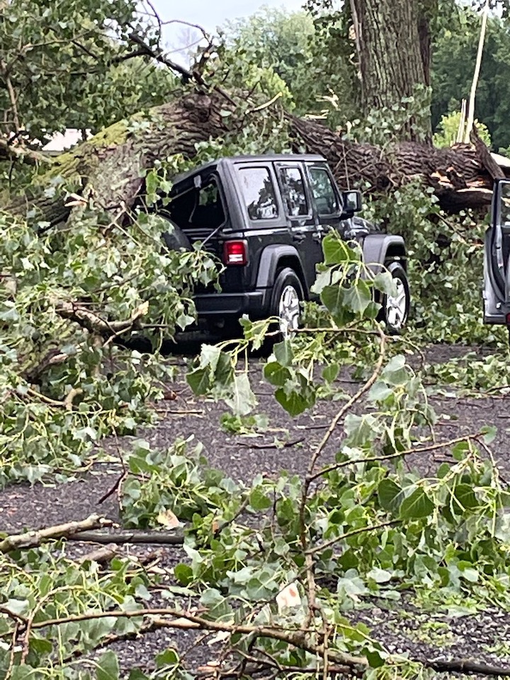 One automobile that was parked in the lot was severely damaged by a falling tree, but no one was hurt.