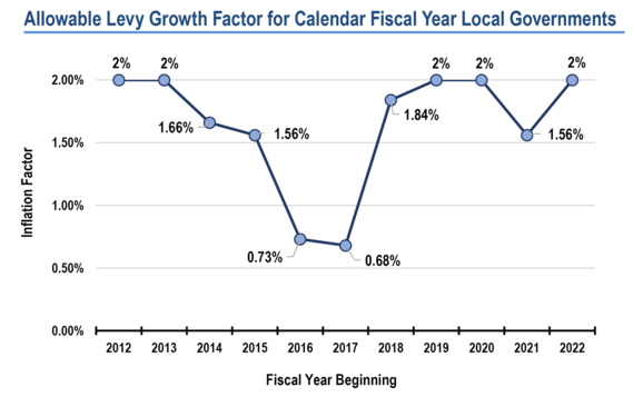 The 2% cap for the 2022 fiscal year is the third time since 2019 that municipalities with a calendar year fiscal year (Jan. 1 through Dec. 31) had their levy growth capped at that amount. In 2021, the allowable levy growth was 1.56%.