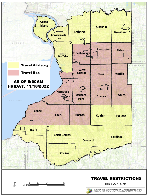 “This updated map shows the current travel restrictions for Erie County, with red-shaded areas having a travel ban and yellow-shaded areas having a travel advisory.