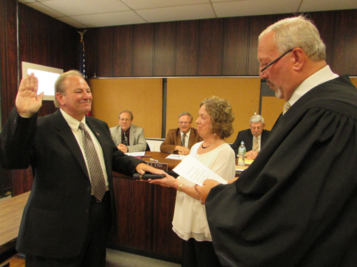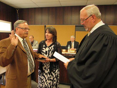 The Hon. Town of Lewiston Judge Hugh Gee officiated the swearing-in Monday of Mayor Terry Collesano (above) and trustees Vic Eydt (below) and Dan Gibson (bottom). All three, and Deputy Mayor Bruce Sutherland, won their respective elections last month. (photos by Joshua Maloni)