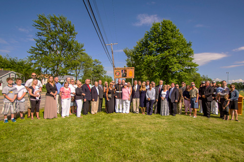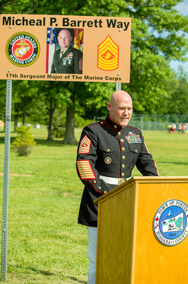 In the photos, the sergeant major is shown addressing visitors, as friends, family and a number of local, county and state officials join with Barrett at the sign dedication. (photos by Wayne Peters)