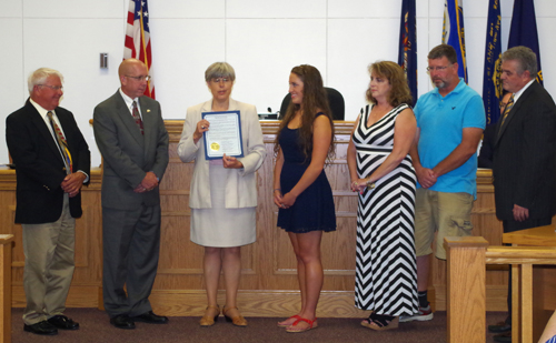 The Grand Island Town Board issued a proclamation to Girl Scout Margaret Rustowicz on the occasion of her receiving her Gold Award, the highest honor in Girl Scouts. Rustowicz is joined by the members of the Town Board and her parents, Maura and Kevin, in receiving the proclamation from Supervisor Mary Cooke. (photo by Larry Austin)