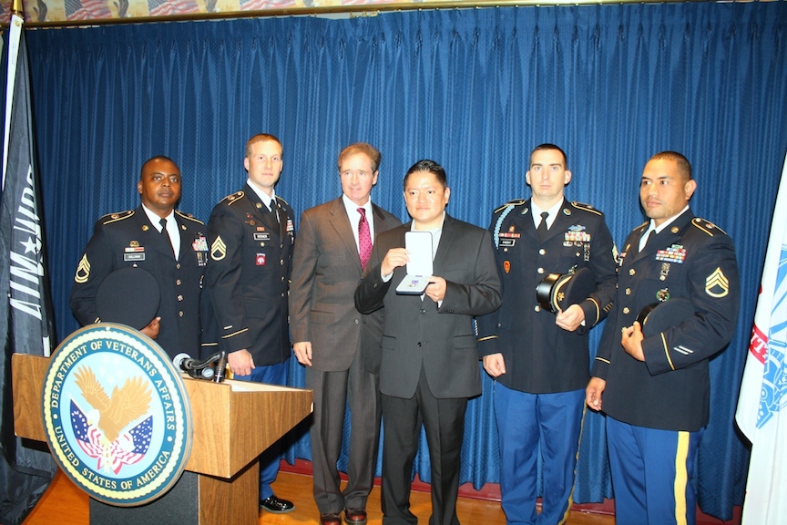 Congressman Brian Higgins presented United States Army veteran Sgt. Benjamin Benally with the Purple Heart for injuries sustained while serving in Afghanistan. Participating in the ceremony, which took place at the VA Western New York Health Center in Buffalo Monday, was Buffalo VA Medical Center Director Brian Stiller, the Buffalo Recruiting Company U.S. Army Color Guard and members of Military Order of the Purple Heart, Chapter 187.
