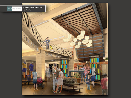The preliminary design contemplates a "Mercantile Exchange" concept, with multiple vendors and stores providing a variety of products and amenities to HARBORCENTER guests and visitors. In the first phase of the plan, as much as 10,000 square feet will be available facing Main Street on the southwest side of the project. While design plans have yet to be finalized, that assumes the footprint immediately available is expanded to include a mezzanine level.