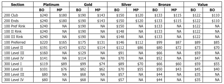 The pricing plan for the 2014-15 season includes one Platinum game (Nov. 15 vs. Toronto), seven Gold games, 14 Silver games, 11 Bronze games and eight Value games.