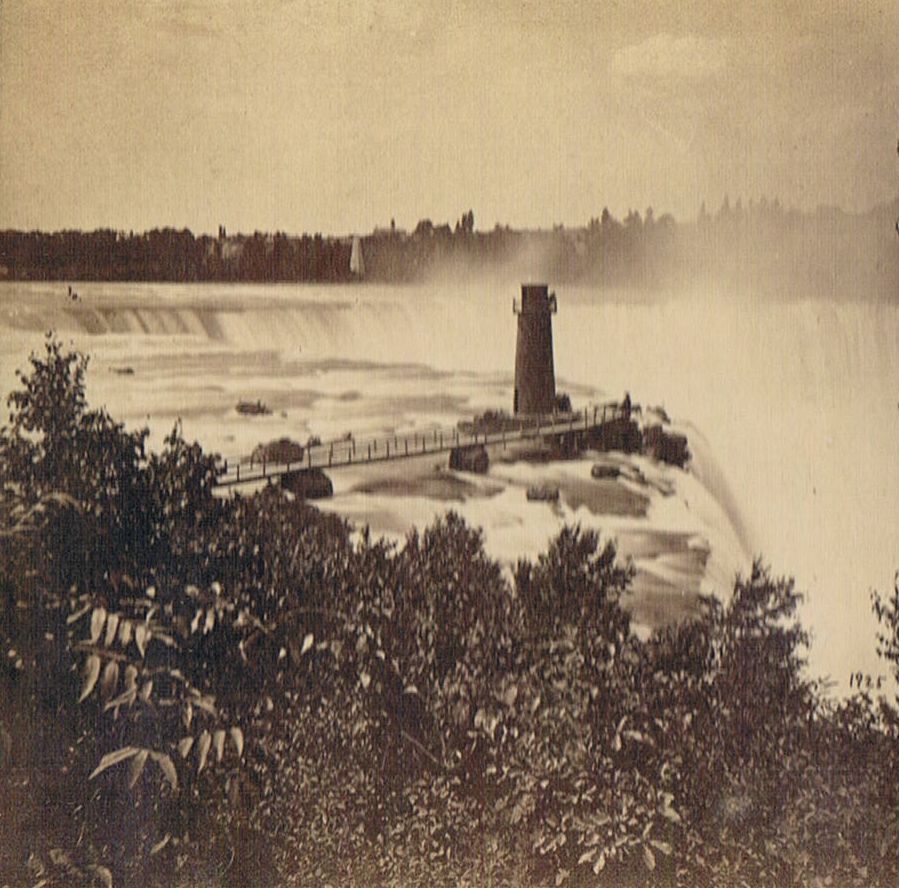 Terrapin Tower was built in 1833 at the brink of the Horseshoe Falls just off Goat Island. It became a dominating feature of the falls' landscape for 40 years until its demolition in 1873. The stonemason was Robert Nichols, an ancestral grandfather of Buttery. Nichols died in 1834 and is buried at Oakwood Cemetery. He is known as the builder of the Lewiston Presbyterian Church, which still stands.