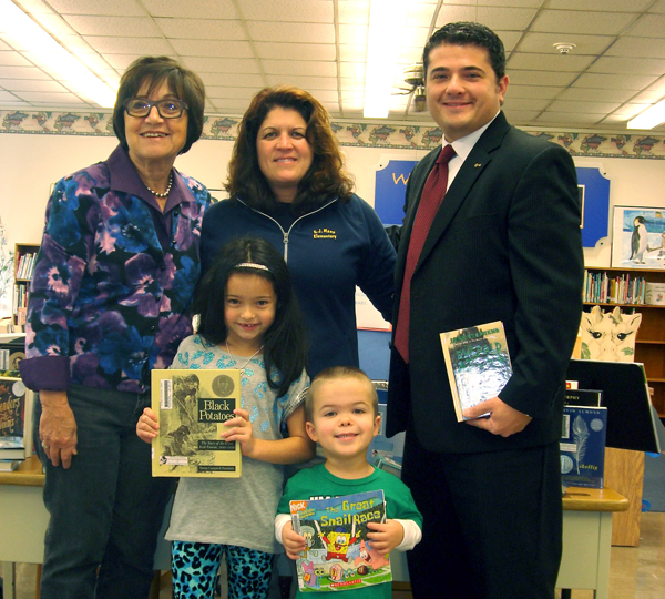 Pictured with first-grade students Aiden Gallineau and Alainna Magadinno, from left, are Maria DelSignore, grant writer; Tina Smeal, Mann Elementary principal; and Joe Philippone, Grand Island Rotary Club president.