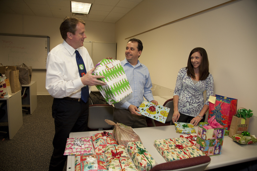 First Niagara's Bob Roeder, Gary Blaser and Sabrina Laughton were among the team members who volunteered at Thursday's toy and book give-away and holiday party at the Harvest House New Hope Education Center.