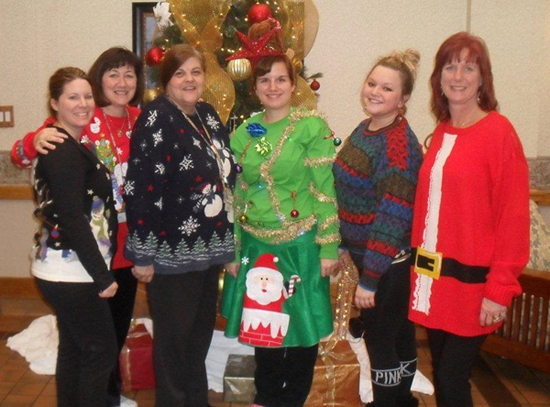Above, Kim Mitchell (center), activity leader from Lockport was the winner of the ugly sweater contest. She is pictured with her colleagues from left: Danielle Dolan, director of rehabilitation from Wheatfield; Sheri Palame, diet tech from Tonawanda who won second place; Dawn Carroll, resident care coordinator from Tonawanda; Rachel Bolton, activity leader from Depew who won third place; and Cheryl Kratts, COTA from North Tonawanda.