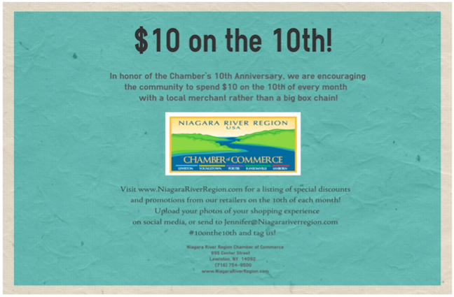 In honor of the Niagara River Region Chamber of Commerce's 10th anniversary in 2015, the agency is encouraging the community to spend $10 with a local merchant on the 10th of every month, rather than a "big-box" chain.