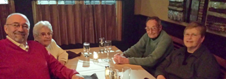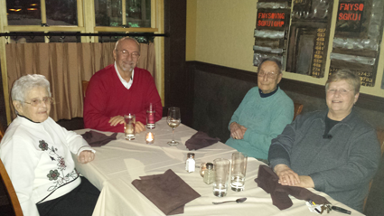 George Decker (in blue) will celebrate his 100th birthday Monday, Feb. 16. The former Lewiston-Porter teacher and guidance counselor celebrated this week with dinner at Center Cut: The Village Steakhouse on Center Street. Mary Foss (far left), George and Jackie Sutherland joined him.