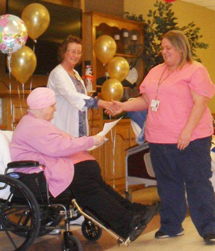 Pictured, Rachel Gaston, LPN unit coordinator, accepts her award from resident Dorothy Stickney, formerly of North Tonawanda, and Director of Nursing Sherry Trinkwalder of North Tonawanda.