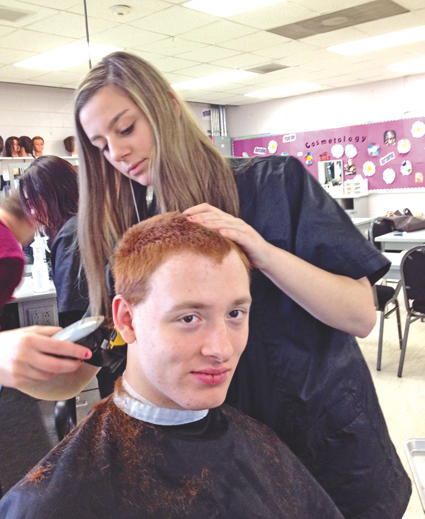 Pictured, Summer Den Haese (Niagara-Wheatfield) gives Mitchell Warnick (Niagara-Wheatfield) a haircut.