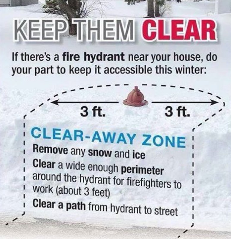 "Snow should be removed about three feet away from the hydrant in all directions, with a pathway cleared between the hydrant and the roadway, so your local firefighters can access them readily if they need to," he said. Schultz provided these graphics, demonstrating proper hydrant clearing.