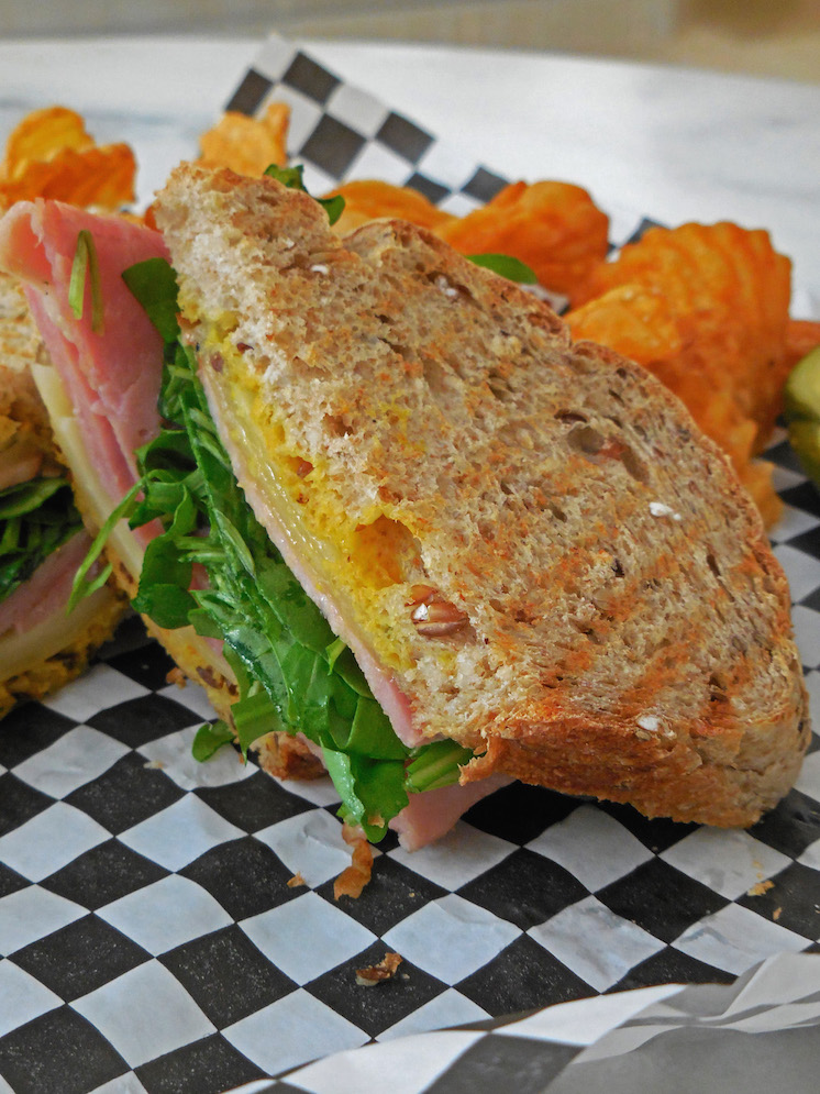 In 15 minutes, our meal was delivered. The chef plopped it on our table with a mumbled "Enjoy" before walking away. Despite her attitude, we were quite ready to chow down. The sandwich was cut in two and served with chips and a pickle. During the first bite, the crunchy, oozy, tangy flavors all mixed together quite nicely. The meat used was not your everyday, thinly sliced ham. It was thick in width, heavy with a smoky flavor and very succulent. It complimented the creamy yet sharp Provolone cheese used in plentiful slices. The arugula was out of this world with its bitterness meshing well with the splashes of honey mustard. All of these ingredients were pressed between two crunchy slices of toasted sourdough bread. The homemade sea-salt sprinkled chips and juicy pickle made an excellent side platter. A ginger ale is highly recommended to help wash down this delightful sandwich.
