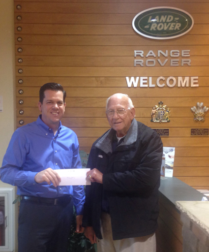 Floyd Doring, right, founder of the Father's Day Lawn Mower Race, Classic Car Show & Kevin Doring 5K Walk and 10K Run, receives a sponsorship donation for the event from Todd Runions, sales manager of Northtown Volvo, Porsche & Land Rover of Buffalo. The event will take place Saturday, June 20, along the Island's West River and is a fundraiser for the Grand Island Relay For Life in support of the American Cancer Society.
