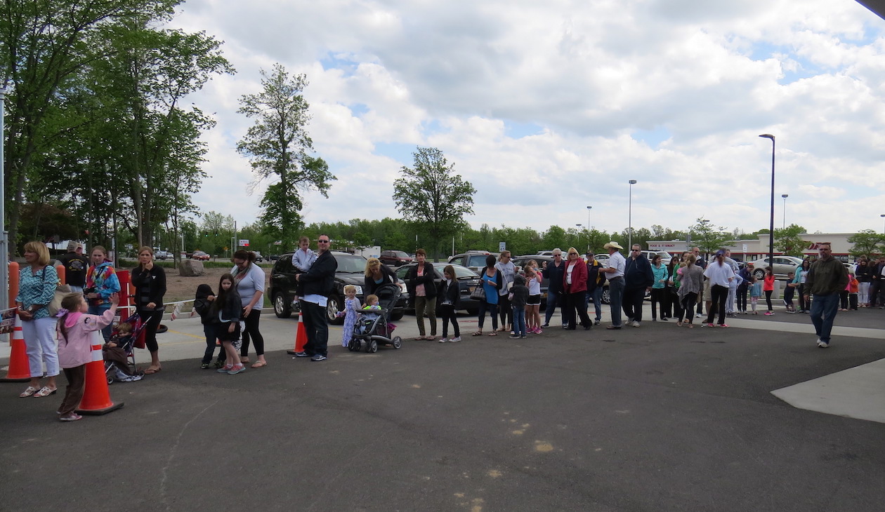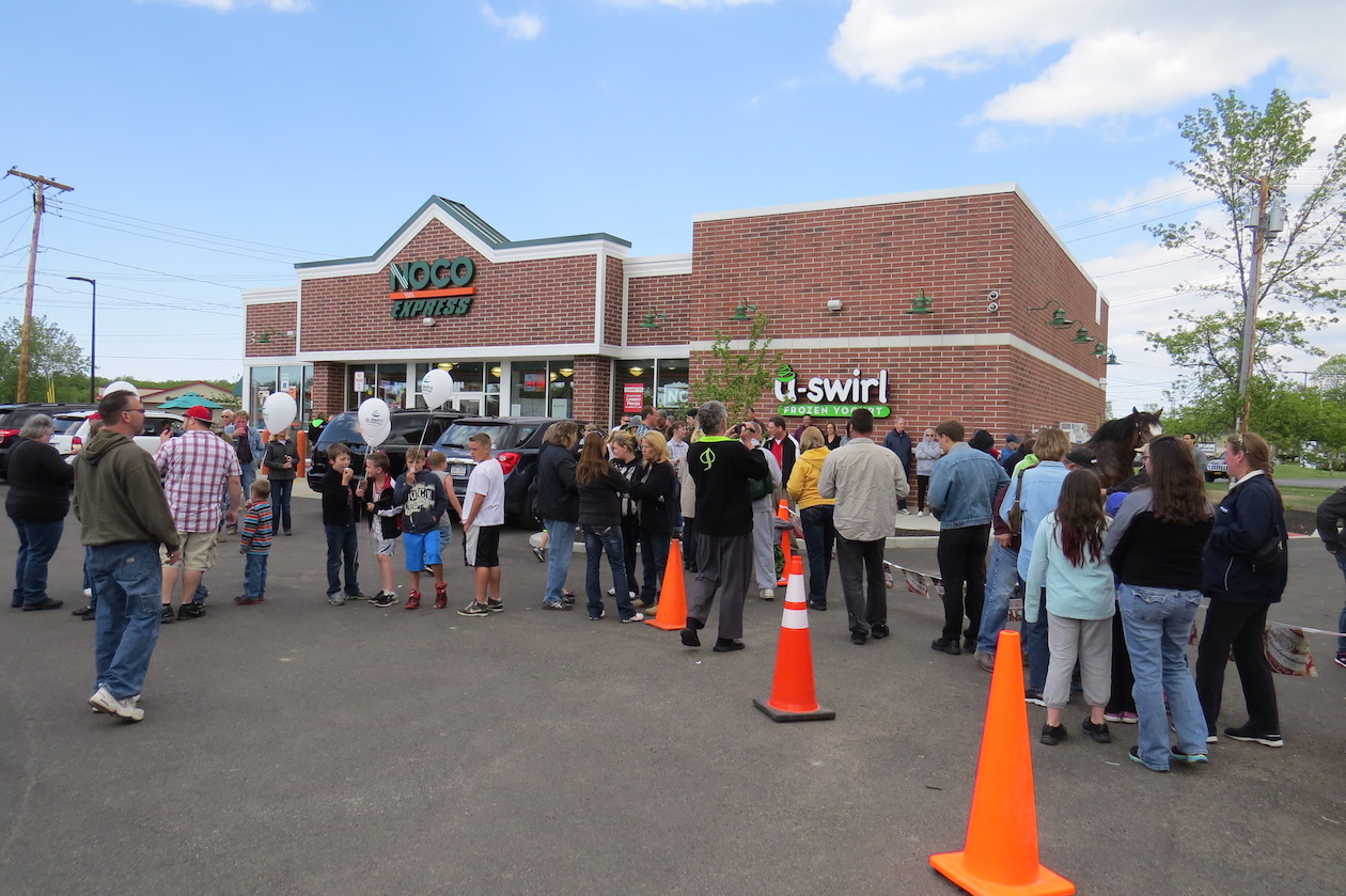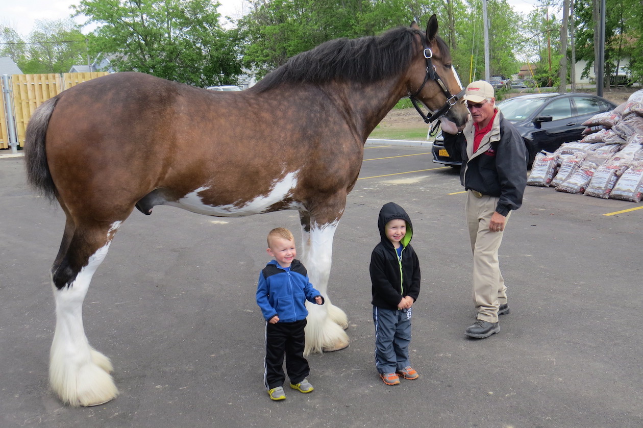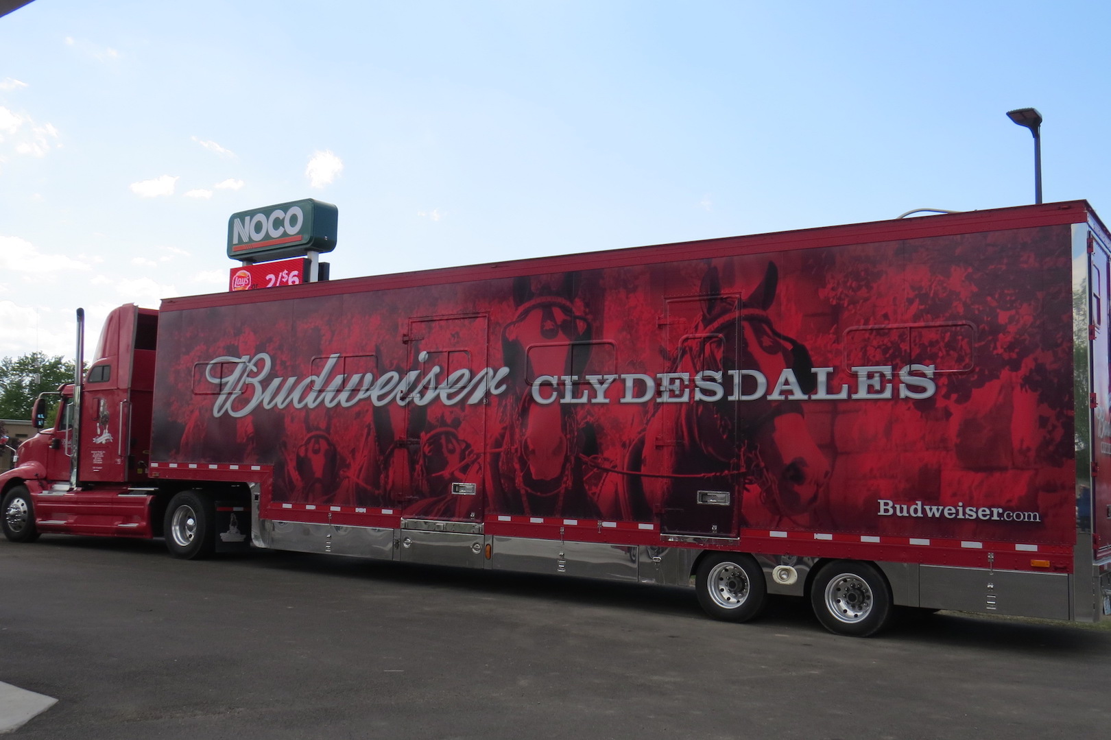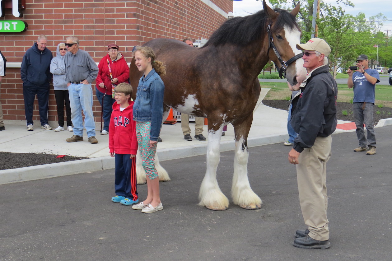 A world-famous Budweiser Clydesdale stopped by the new NOCO Express at the corner of Grand Island Boulevard and Whitehaven Road Friday afternoon. Scores of people lined up in the parking lot to see and take pictures with the horse, its handlers and its distinctive red truck.