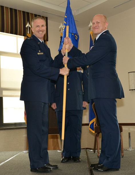 Lt. Col. R Gary Charlton II accepts the guidon of the 107th Operations Group from Col. Robert Kilgore, commander of the 107th Airlift Wing during a change of command ceremony on May 18.