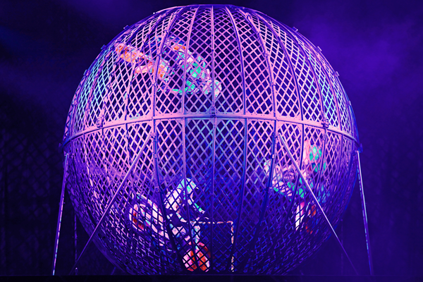 Starting July 15, the roar of multiple motorcycles will rip through the air when the Motorcycle Thunderdome rolls into town for a three-week stint. This high-thrills act will feature two to three motorcyclists weaving seemingly impossible patterns around the inside of the steel globe, narrowly missing one another in the process. The act concludes with one person standing in the center of the globe while the other motorcyclists whirl around him.