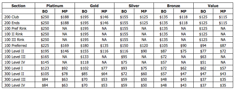 A breakdown of ticket prices for the 2015-16 season is below, marked for box office (BO) and mini-pack (MP) prices. The full season schedule with game pricing designations can beDOWNLOADED here.