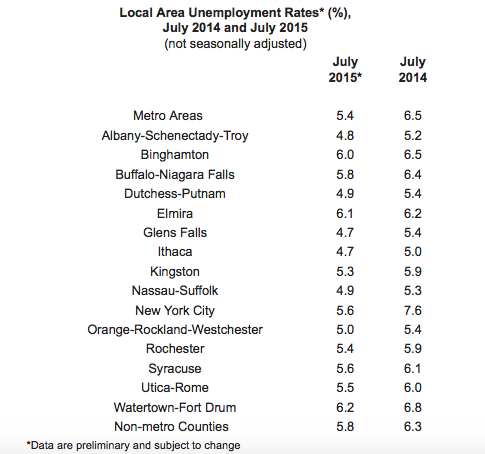 The New York State Department of Labor has released preliminary local area unemployment rates for July 2015. Rates are calculated following procedures prescribed by the U.S. Bureau of Labor Statistics. The state's unemployment rate relies in part on the results of the current population survey, which contacts approximately 3,100 households in New York each month.