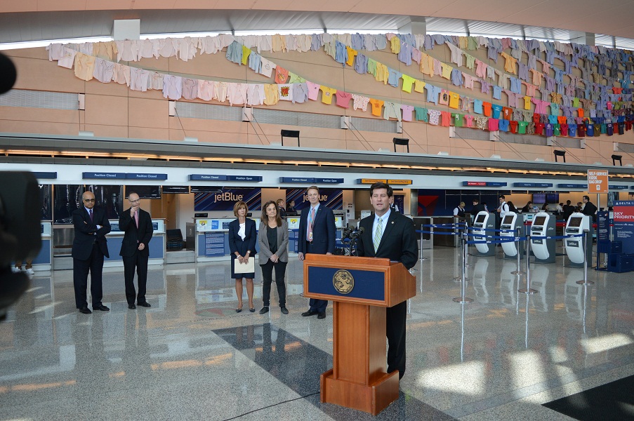 Erie County Executive Mark C. Poloncarz is joined by Albright-Knox Art Gallery and NFTA officials to announce the installation of "We Share a Dream" at the Buffalo Niagara International Airport. The expansive artwork, the creation of artist Karina Kaikkonen, incorporates shirts donated from thousands of Erie County residents and will bring a colorful greeting to all airport visitors.