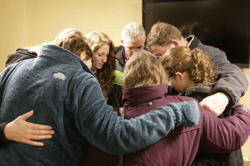 A group prays together before going out to deliver.
