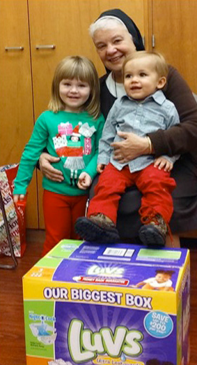 Sister Mary Johnice Rzadkiewicz is pictured with Rebecca Hartman and Maxwell Somogyi after they brought some of the 3,000 diapers that were donated during the Sister Johnice Diaper Drive on Dec. 12 and 13 at St. Stephen R.C. Church. The diapers were delivered to the sister at St. Adalbert's Response to Love Center at 130 Kosciuszko St., Buffalo.