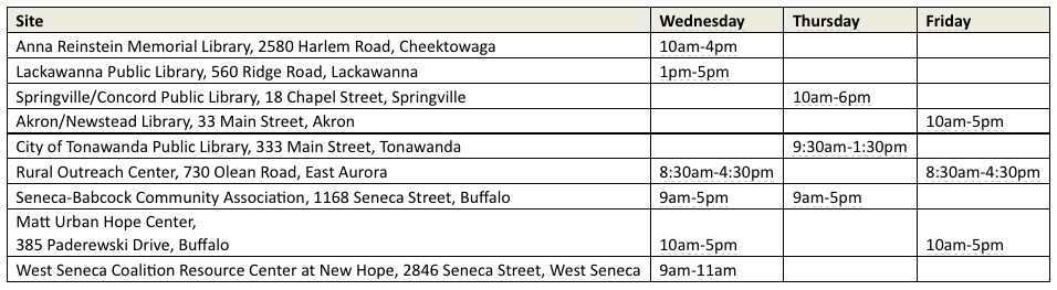 For more information on applying for HEAP, call 716-858-7644, apply online at www.mybenefits.ny.gov, or ask for the community assistance intern at any of the locations below.