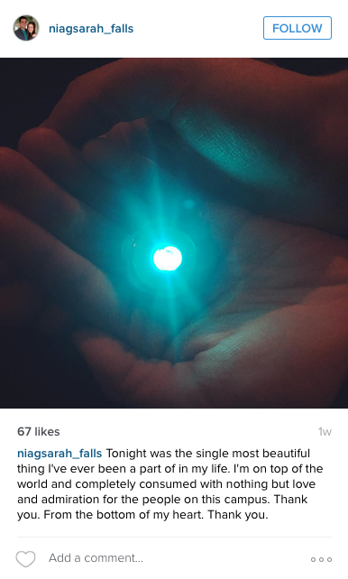 Some students even shared their thoughts on social media. Graduating senior Sarah Joslin Instagrammed a picture of the light students lit in honor of sexual assault victims. She referred to Take Back the Night as "The single most beautiful thing I've ever been a part of in my life."