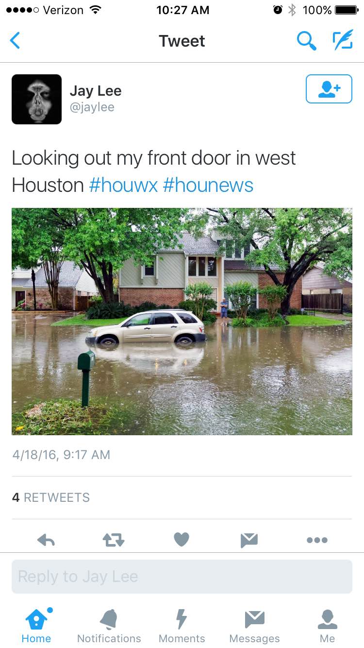 Emmett had estimated almost 240 billion gallons of rain had fallen on the Houston region by the end of that afternoon. He called it the most significant flood event since Tropical Storm Allison in 2001, causing more than $5 billion in property damage in Harris County alone and leaving 41 people dead.