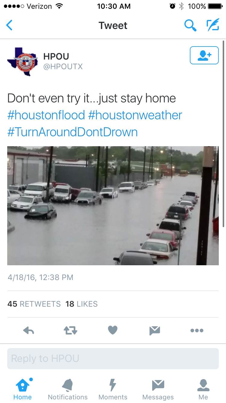 Authorities had been describing extremely dangerous weather conditions. "This is a life-threatening emergency," said the city on an emergency website. "Houston residents should avoid travel at all costs today."