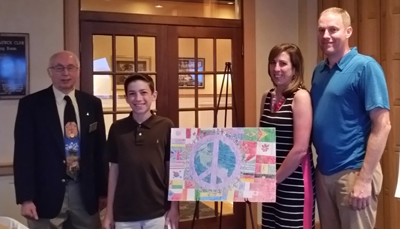 Pictured is T.J. Bender from the Connor Middle School, with his first-place peace poster along with his parents, Jennifer and Jonathan Bender. Bender, who received a $100 award, did a brief "show-and-tell" of his winning peace poster and explained what peace means to him. Lion Paul Bassette, the Peace Poster Contest chairman, is pictured on the left. The second-place winner of a $50 award was Hailey Watches from Connor Middle School with her poster at the right. The posters will be displayed for one year at the Grand Island Memorial Library.