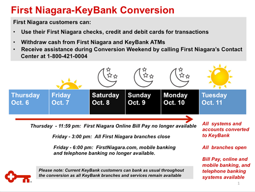 Jodi Johnston, director of corporate media relations for First Niagara Financial Group, said, "KeyBank is taking extra steps to help colleagues joining the team from First Niagara to have a complete and comfortable understanding of KeyBank process - and to assist in making this transition a seamless one for our customers. The "Branch Buddy" program is taking effect, in which more than 600 KeyBank employees will support our new colleagues during the conversion."