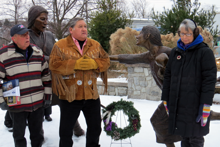 Neil Patterson placed a wreath at the monument and reminded guests that the Tuscaroras' determination to protect non-Indians from other Native Americans was unprecedented. He noted the Tuscaroras also worked to save Mohawks living in Lewiston.