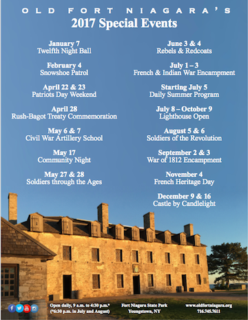 Old Fort Niagara is open daily from 9 a.m. to 5 p.m. through June and from 9 a.m. to 7 p.m. in July and August. Admissions end 30 minutes before closing. Regular admission to the fort is $12 per adult, $8 per child ages 6-12, free for children 5 and under, and free to members of Old Fort Niagara. Certain discount and group admissions apply. Visit www.oldfortniagara.org for details.