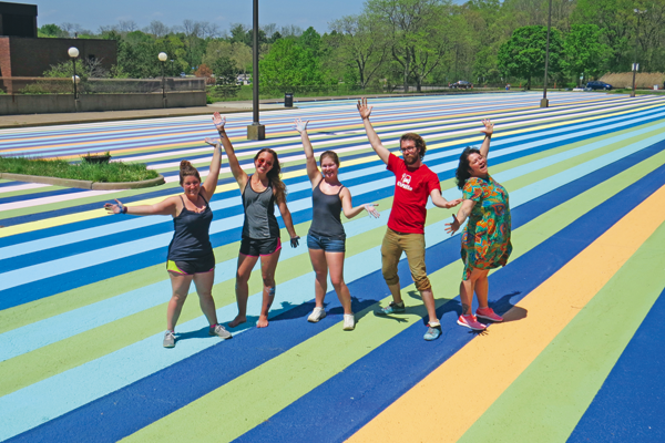 Artpark & Company Director of Visual Arts & Family Programs Tanis Winslow (far right) and a team of her painters marked the completion of "Niagara 1979." The performing and visual arts venue faithfully recreated the late Gene Davis' "Painted Parking Lot."